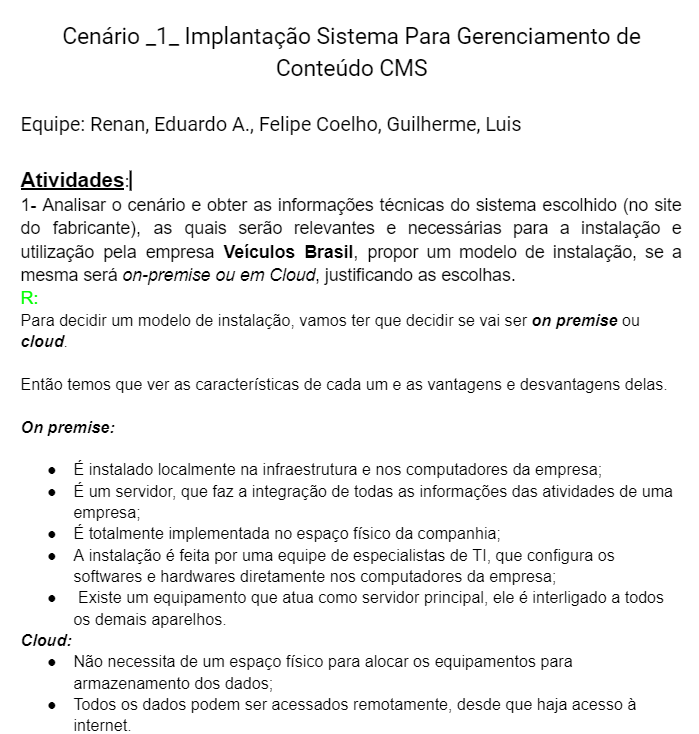 Nosso objetivo era o de pensar na forma de gerenciar os servidores de uma empresa e ver se o formato escolhido deve ser em "CLOUD" ou em "ON PREMISE".