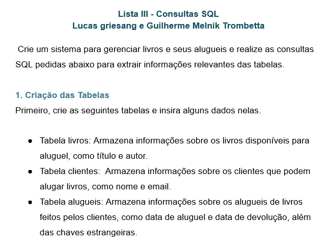 Objetivo: Criar um sistema para gerenciar livros e seus alugueis e realizar as consultas SQL pedidas para extrair informações relevantes das tabelas.